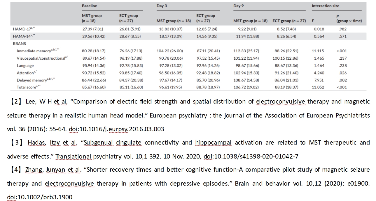 數據模型顯示,MST刺激更加聚焦,對海馬影響較小[2]。電生理分析顯示,ECT組腦電圖癲癇發(fā)作時間與軀體抽搐發(fā)作的時間比值顯著大于MST組,且不隨治療次數而變化,提示MST發(fā)作更加聚焦[1]。臨床研究提示,認知的變化與海馬激活減少有關[3]。RBANR顯示,MST組的即刻記憶(Immediate Memory)、注意力(Attention)、延遲記憶(Delayed Memory)等指標更優(yōu)于ECT組[4]。