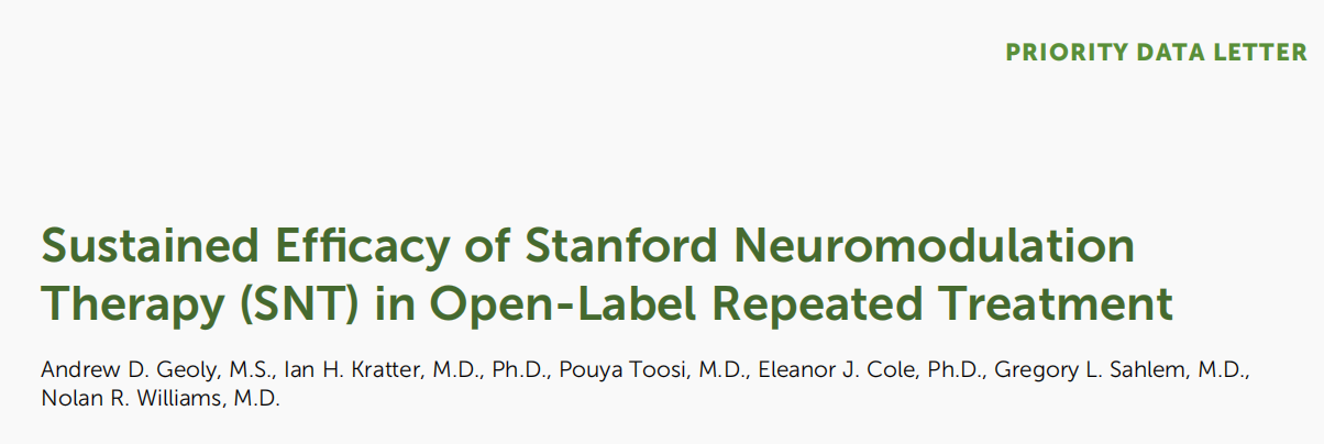 [5]GeolyAD, Kratter IH, Toosi P, Cole EJ, Sahlem GL, Williams NR. Sustained Efficacy of Stanford Neuromodulation Therapy (SNT) in Open-Label Repeated Treatment. Am J Psychiatry. 2024;181(1):71-73.