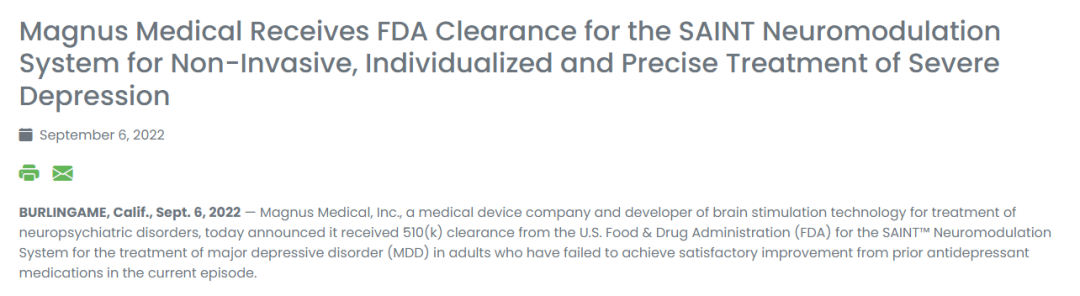 2022年9月6日美國消息,斯坦福加速智能神經(jīng)調(diào)節(jié)療法(SAINT)被美國FDA批準(zhǔn)可用于重度抑郁癥的治療。