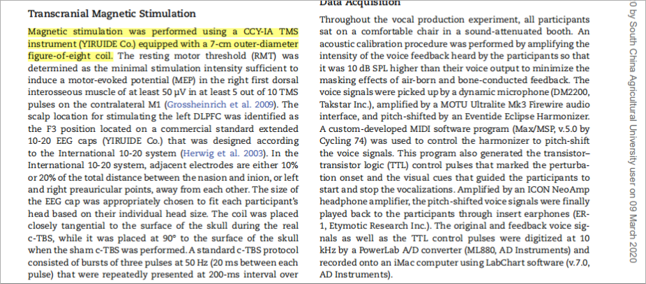 2016年,應(yīng)用CCY-IA型機發(fā)表在Frontiers in Human Neuroscience(IF=3.209 )上的“1-hz repetitive Transcranial Magnetic stimulation over the Posterior Parietal cortex Modulates spatial attention”;