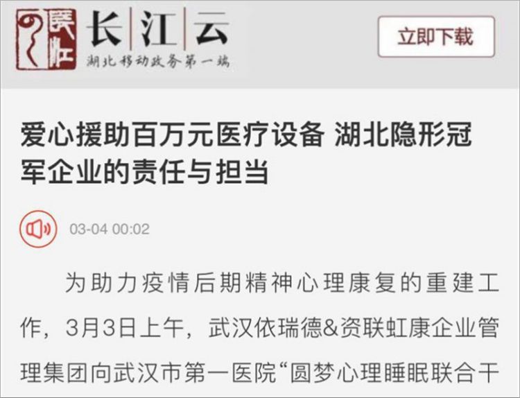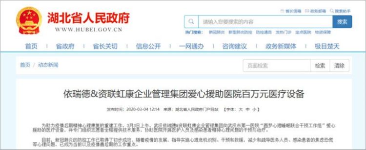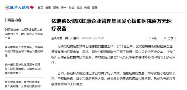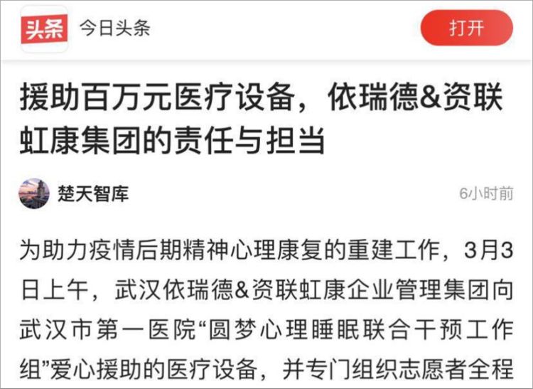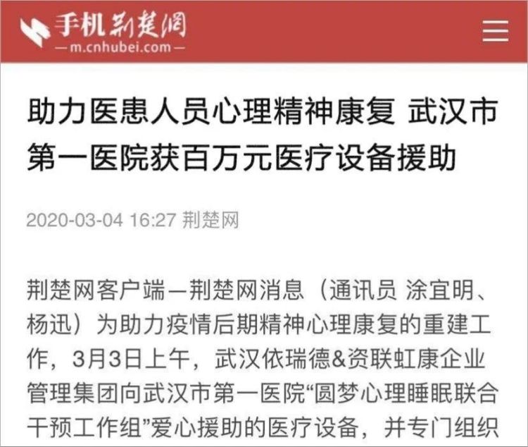 3月3日上午,武漢依瑞德&資聯(lián)虹康企業(yè)管理集團(tuán)向武漢市第一醫(yī)院愛心援助了一臺(tái)經(jīng)顱磁刺激儀和一臺(tái)經(jīng)顱電刺激儀,并專門組織志愿者全程提供技術(shù)服務(wù),助力醫(yī)患人員的精神心理康復(fù)。此事受到了廣大媒體的極大關(guān)注,包括新華網(wǎng)、湖北日?qǐng)?bào)、湖北省人民政府網(wǎng)、今日頭條、荊楚網(wǎng)等多家媒體都紛紛報(bào)道。