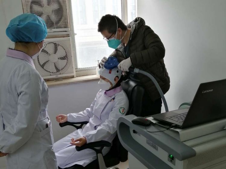 ▲武漢市第一醫(yī)院醫(yī)務(wù)人員體驗(yàn)經(jīng)顱磁刺激儀