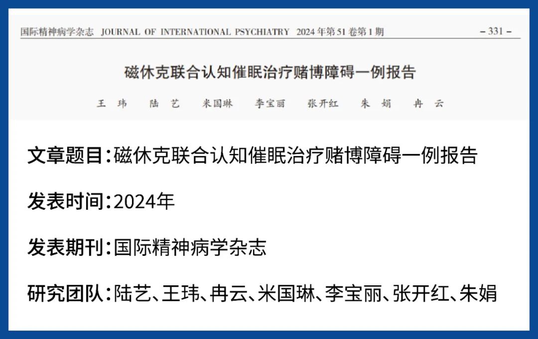 王瑋,陸藝,米國琳等.磁休克聯(lián)合認(rèn)知催眠治療賭博障礙一例報(bào)告[J].國際精神病學(xué)雜志,2024,51(1):331-333.