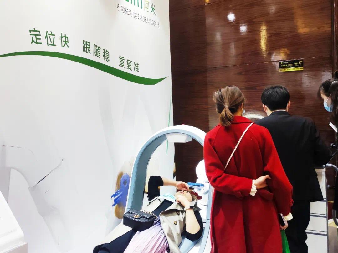 與會人員參觀阿米 其中,阿米磁刺激智能機器人系統(tǒng)吸引了眾多專家同仁的目光。阿米融合了人工智能等前沿技術(shù),能有效解決TMS線圈的初始定位繁瑣、過程定位偏移、重復(fù)定位不準(zhǔn)等眾多臨床應(yīng)用問題,并有效保障TMS臨床和科研數(shù)據(jù)的客觀性。