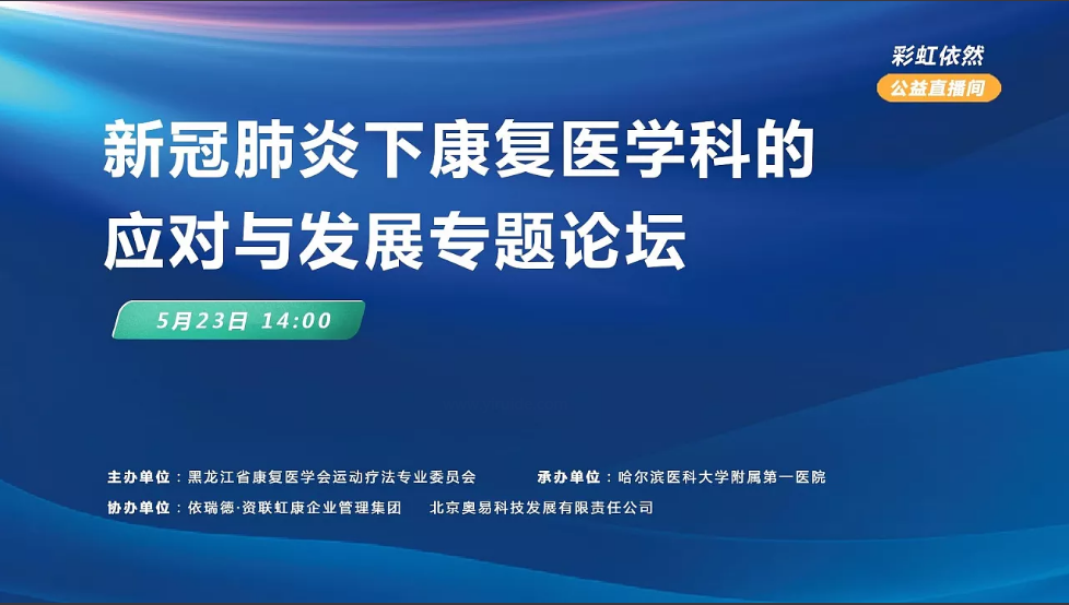 2020年5月23日,由黑龍江省康復(fù)醫(yī)學(xué)會運(yùn)動療法專業(yè)委員會主辦,哈爾濱醫(yī)科大學(xué)附屬第一醫(yī)院承辦,依瑞德·資聯(lián)虹康企業(yè)管理集團(tuán)及北京奧易科技發(fā)展有限責(zé)任公司協(xié)辦,通過彩虹依然公益直播間召開的彩虹云會議“新冠肺炎下康復(fù)醫(yī)學(xué)科的應(yīng)對與發(fā)展專題論壇”圓滿落幕。