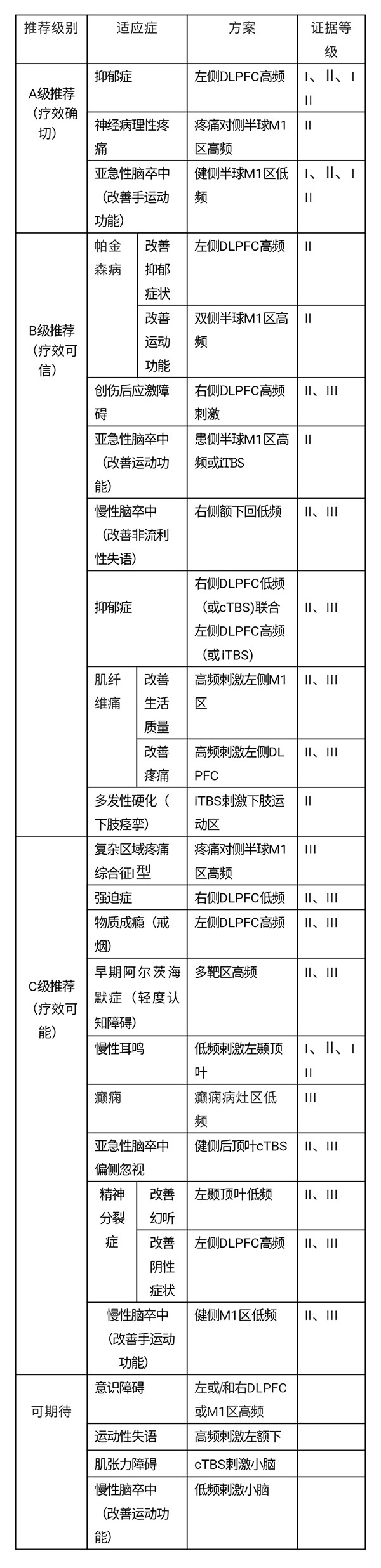 表1 基于循證醫(yī)學(xué)的rTMS臨床治療指南(2014年至2018年更新)