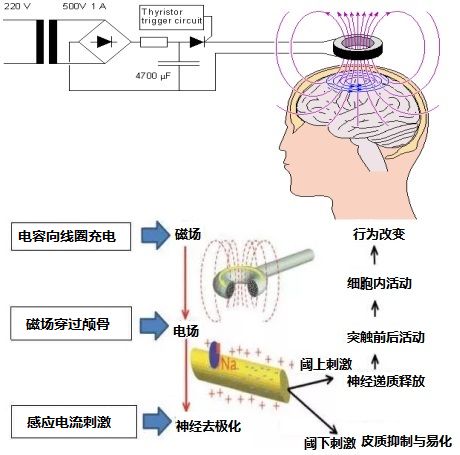 磁刺激(MS)是一種基于電磁感應(yīng)與電磁轉(zhuǎn)換原理,利用線(xiàn)圈內(nèi)的瞬變電流產(chǎn)生的強(qiáng)磁場(chǎng)穿透顱骨或骨骼的神經(jīng)刺激技術(shù)。作用于頭部的稱(chēng)為經(jīng)顱磁刺激(TMS),作用在頭部以外的區(qū)域稱(chēng)為功能磁刺激(FMS ),MS在中樞神經(jīng)系統(tǒng)內(nèi)產(chǎn)生的感應(yīng)電流可引發(fā)一系列生理、生化反應(yīng),進(jìn)而發(fā)生功能和行為改變來(lái)達(dá)到治療的目的(圖1)。