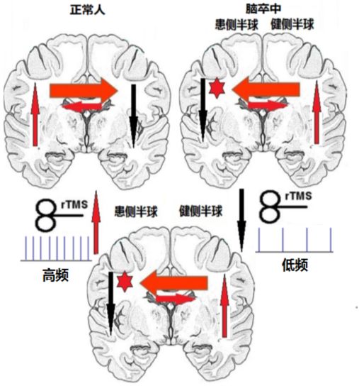人類(lèi)左、右半球間進(jìn)化的不對(duì)稱(chēng)性,左半球?yàn)閮?yōu)勢(shì)半球,兩半球之間通過(guò)“經(jīng)胼胝體抑制”機(jī)制維持著一種恒定的彼此抑制關(guān)系,左半球?qū)τ野肭蛴休^強(qiáng)的抑制。當(dāng)一側(cè)半球損害興奮性降低時(shí),則不能抑制對(duì)側(cè)半球,使對(duì)側(cè)半球過(guò)度興奮,并反向抑制患側(cè)半球,加劇患側(cè)半球損害,rTMS治療需要利用半球間競(jìng)爭(zhēng)機(jī)制,通過(guò)低頻抑制健側(cè)半球M1區(qū)和/或高頻興奮患側(cè)半球M1區(qū)(圖3)。健側(cè)半球低頻刺激在可在急性、亞急性期即可開(kāi)始治療,患側(cè)半球高頻刺激通常在亞急性期開(kāi)始。