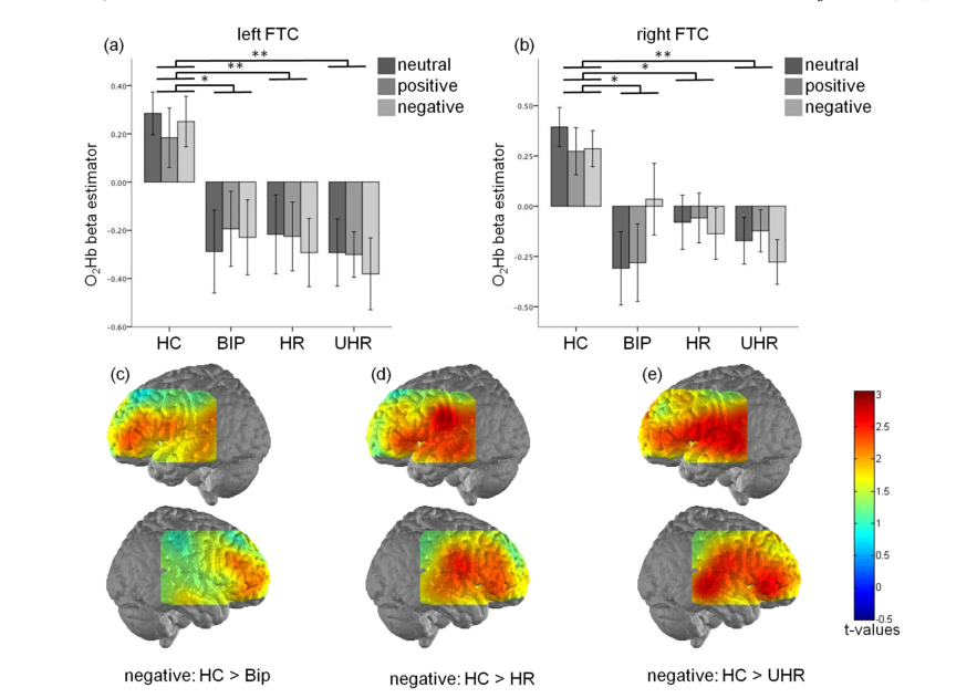 本項研究的目的是通過前額葉和額顳葉的大腦活動,研究精神分裂風險個體和雙相情感障礙風險個體在情緒配價和中性詞匯的加工過程。與HC相比,所有危險組的雙側(cè)FTC的激活均較低。任務水平上能夠發(fā)現(xiàn)精神分裂癥風險個體的注意力處理一般缺陷。精神分裂癥患者的雙側(cè)DLPFC和FTC活性較低,雙相情感障礙患者僅在左側(cè)DLPFC和FTC活性方面存在差異。