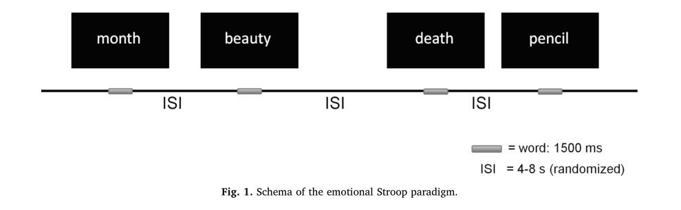 情緒Stroop任務是一種對經(jīng)典Stroop任務進行修正的任務范式,旨在評估情緒刺激對注意過程的影響。情緒Stroop效應是指對情緒詞和中性詞的平均反應時間的差異,即所謂的情緒干擾。