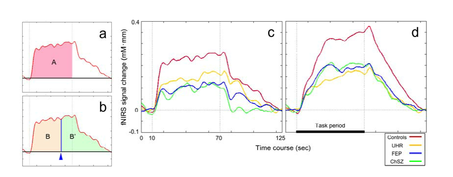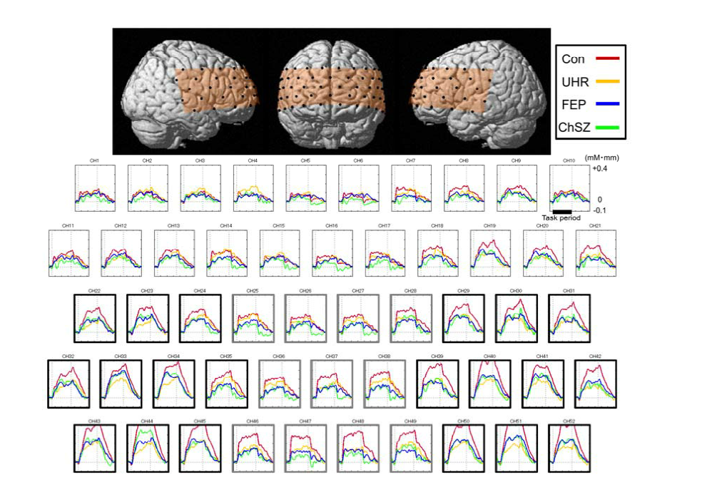 共有144名參與者,其中包含47名精神病超高風(fēng)險(UHR)個體(18 drug-na?ve), 30名首發(fā)精神病(FEP)患者(6 drug-na?ve), 34名慢性精神分裂癥(ChSZ)患者(1 drug-na?ve)和33名健康對照者參與。對照組的性別和發(fā)病前的智商與其他組匹配,年齡與FEP和ChSZ組匹配。FEP患者、ChSZ患者及健康對照組來自2009年7月至2014年6月之間招募,獨立于之前的研究。在基線測量后12個月,使用相同的fNIRS程序測量了34例UHR患者(72%)、21例FEP患者(70%)和33例對照組的血流動力學(xué)反應(yīng)。