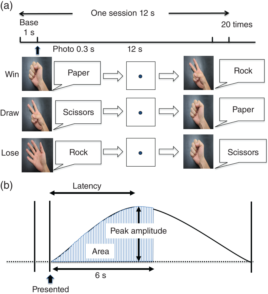 屏幕上隨機呈現石頭,布和剪刀的手勢,要求受試者在獲勝、失敗和平局的條件下分別給出口頭回答。