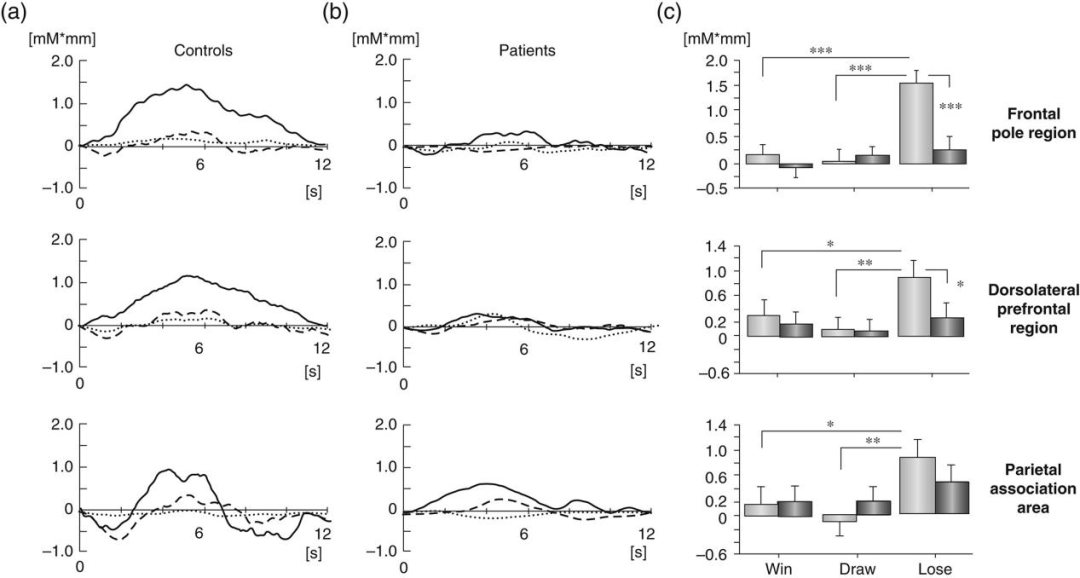 (c)輸掉任務期間對照組的氧合血紅蛋白變化(Δoxy-Hb)顯著高于其他任務,但患者組未見明顯變化。