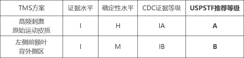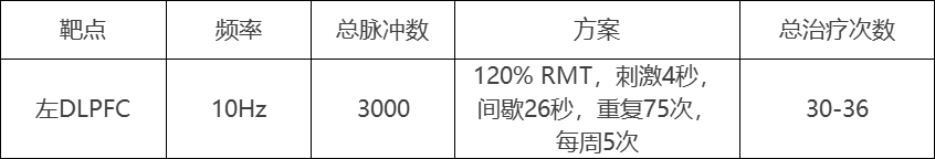 對(duì)于PTBI-HA共病嚴(yán)重抑郁癥患者,建議至少進(jìn)行10次治療(間隔24小時(shí)和< 72小時(shí)),頻率10-20Hz, 每次2000-3000個(gè)脈沖,刺激強(qiáng)度取靜息運(yùn)動(dòng)閾值(RMT)的80-90%,刺激左DLPFC。