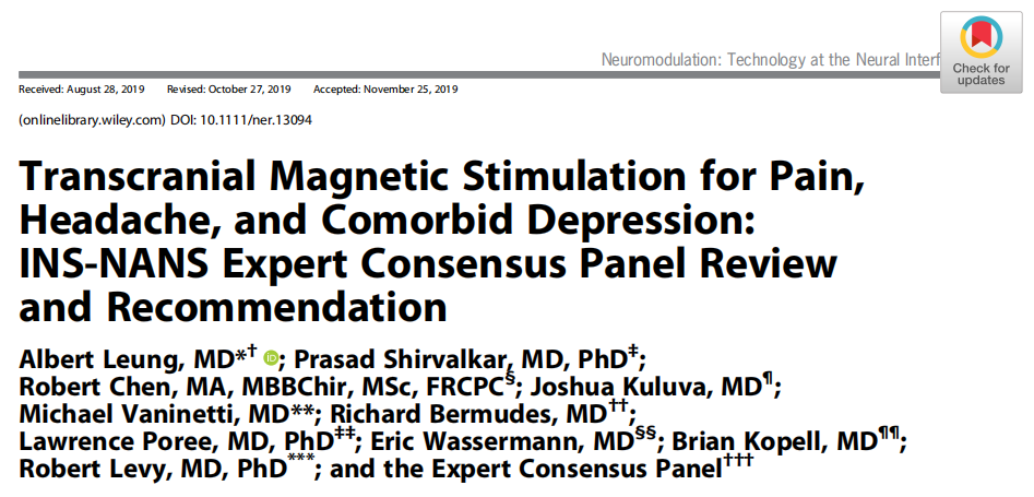 Leung Albert., Shirvalkar Prasad., Chen Robert., Kuluva Joshua., Vaninetti Michael., Bermudes Richard., Poree Lawrence., Wassermann Eric M., Kopell Brian., Levy Robert., and the Expert Consensus Panel.(2020). Transcranial Magnetic Stimulation for Pain, Headache, and Comorbid Depression: INS-NANS Expert Consensus Panel Review and Recommendation. Neuromodulation, Neuromodulation. 2020 Apr;23(3):267-290.