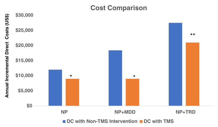 對(duì)于嚴(yán)重的耐藥抑郁癥,每年進(jìn)行70次治療(急性和維持rTMS),1年的費(fèi)用為21,000美元,5年的費(fèi)用為105,000美元。
