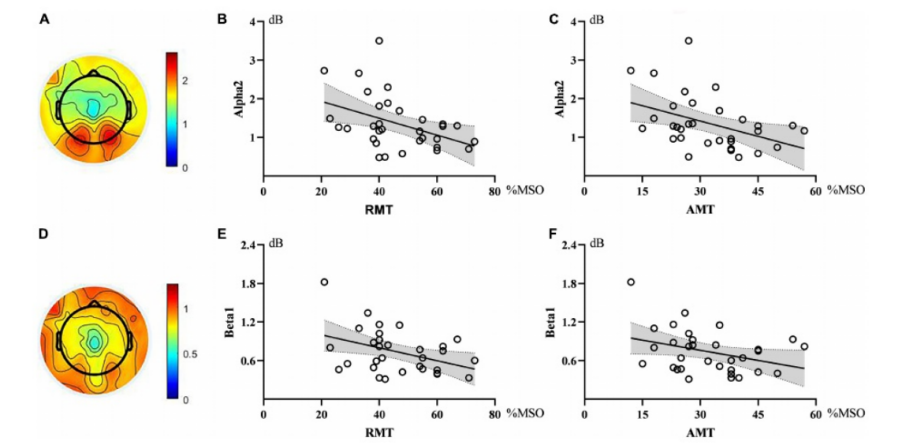地形圖顯示了alpha2振蕩和beta1振蕩的功率。散點圖顯示了腦電圖(EEG)振蕩與運動閾值(B,C,E,F(xiàn))之間的相關性。Alpha2與RMT、AMT均呈顯著負相關。