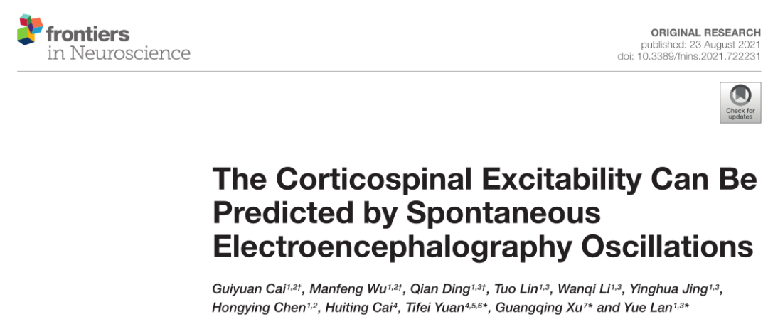 Cai Guiyuan,Wu Manfeng,Ding Qian et al. The Corticospinal Excitability Can Be Predicted by Spontaneous Electroencephalography Oscillations.[J] .Front Neurosci, 2021, 15: 722231.