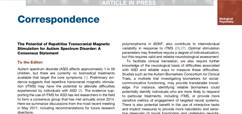 2018年關(guān)于rTMS治療孤獨(dú)癥譜系障礙(ASD,又稱為自閉癥)的潛力的國(guó)際共識(shí)聲明:關(guān)于ASD現(xiàn)有rTMS研究的數(shù)據(jù)表明rTMS具有治療潛力;大型、多位點(diǎn)、雙盲、假對(duì)照試驗(yàn)仍需進(jìn)行,以便對(duì)ASD的神經(jīng)生理學(xué)異質(zhì)性有更深入的了解,從而確定合適的治療方案并最大化臨床結(jié)果。