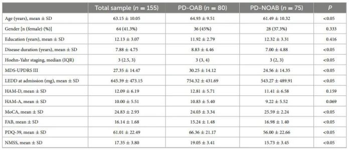 該研究[2]在2021年1月到2022年9月期間從上海交通大學(xué)醫(yī)學(xué)院新華醫(yī)院神經(jīng)內(nèi)科門診和海軍軍醫(yī)大學(xué)第一附屬醫(yī)院神經(jīng)內(nèi)科、神經(jīng)外科門診共招募了155名符合納入排除標(biāo)準(zhǔn)的特發(fā)性PD患者,其中PD伴OAB(PD-OAB)80人,PD不伴OAB(PD-NOAB)75人。