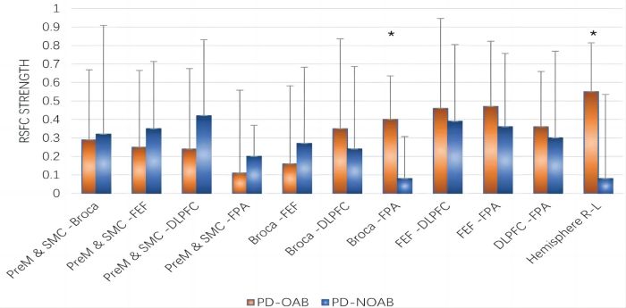 3、雙樣本t檢驗顯示,PD-OAB組雙側(cè)Broca區(qū)(P=0.027)、FPA-L和Broca-R(P=0.006)、以及兩側(cè)半球(P=0.043)之間的靜息態(tài)功能連接(RSFC)強度顯著增加;當(dāng)合并雙側(cè)ROI時,F(xiàn)PA和Broca區(qū)(P=0.032)之間RSFC強度顯著增加,具體見圖4、5。