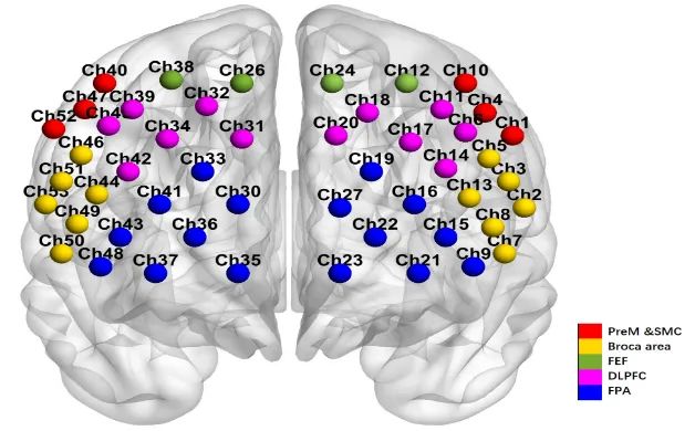 采用武漢資聯(lián)虹康科技有限公司的53通道BS7000近紅外腦功能成像系統(tǒng)監(jiān)測靜息態(tài)和整個VFT范式的執(zhí)行中大腦皮層的血氧變化,近紅外傳感器遵循國際腦電10-20系統(tǒng)標(biāo)準(zhǔn)排布,通道覆蓋雙側(cè)前額葉背外側(cè)區(qū)(DLPFC)、雙側(cè)額極區(qū)(FPA)、雙側(cè)前運動皮層和輔助運動皮層(PreM和SMC)、雙側(cè)布洛卡區(qū)(Broca)、雙側(cè)額眼區(qū)(FEF)具體排布如下圖。