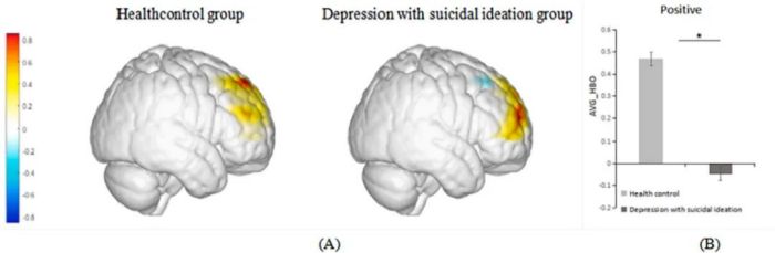 (B)健康對(duì)照組和自殺意念抑郁組正性情緒下右DLPFC平均HbO分布的直方圖。*:p<0.05