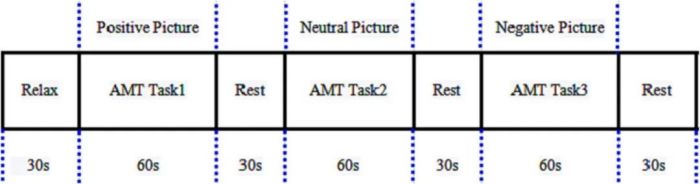 用情感圖片作為線索,勾起受試者對(duì)過(guò)去某些特定情節(jié)的記憶等,以喚起受試者的情緒。試驗(yàn)范式如下: