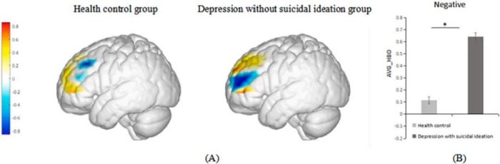 (B)健康對(duì)照組和無(wú)自殺意念抑郁組負(fù)情緒下左DLPFC平均HbO分布的直方圖。*:p<0.05