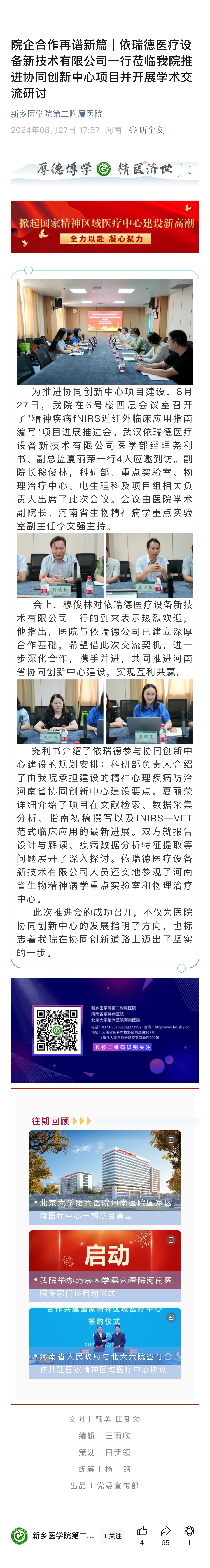 近日,依瑞德集團(tuán)攜手新鄉(xiāng)醫(yī)學(xué)院開(kāi)展"精神疾病fNIRS近紅外臨床應(yīng)用指南編寫"項(xiàng)目進(jìn)展推進(jìn)會(huì)并進(jìn)行學(xué)術(shù)交流研討。本文轉(zhuǎn)載于“新鄉(xiāng)醫(yī)學(xué)院第二附屬醫(yī)院”微信公眾號(hào)。原文內(nèi)容如下: