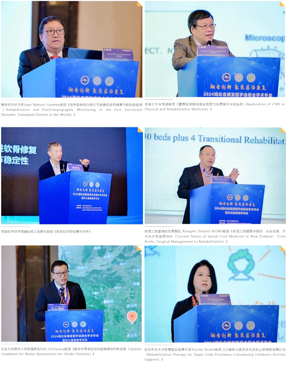 本次會議邀請了中國香港大學(xué)李常威教授分享《重復(fù)經(jīng)顱磁刺激在物理與康復(fù)醫(yī)學(xué)中的應(yīng)用》,美國醫(yī)學(xué)科學(xué)院國際院士勵建安教授分享《銀發(fā)經(jīng)濟的縱橫與思考》,新西蘭基督城伯伍德醫(yī)院 Xianghu (Shaun) XIONG教授分享《新西蘭脊髓醫(yī)學(xué)現(xiàn)狀--從急性期、手術(shù)治療到康復(fù)治療》,日本佐賀大學(xué)附屬醫(yī)院康復(fù)學(xué)系Toyoko Asami教授分享《以輔助兒童活動為主的上肢假肢康復(fù)療法》,日本兵庫醫(yī)科大學(xué)附屬醫(yī)院Yuki Uchiyama教授分享《腦卒中患者運動功能障礙治療新進展》,墨西哥外科學(xué)院Juan Manuel Guzman教授分享《世界首例成功肩關(guān)節(jié)移植患者的康復(fù)與肌電圖監(jiān)測》。