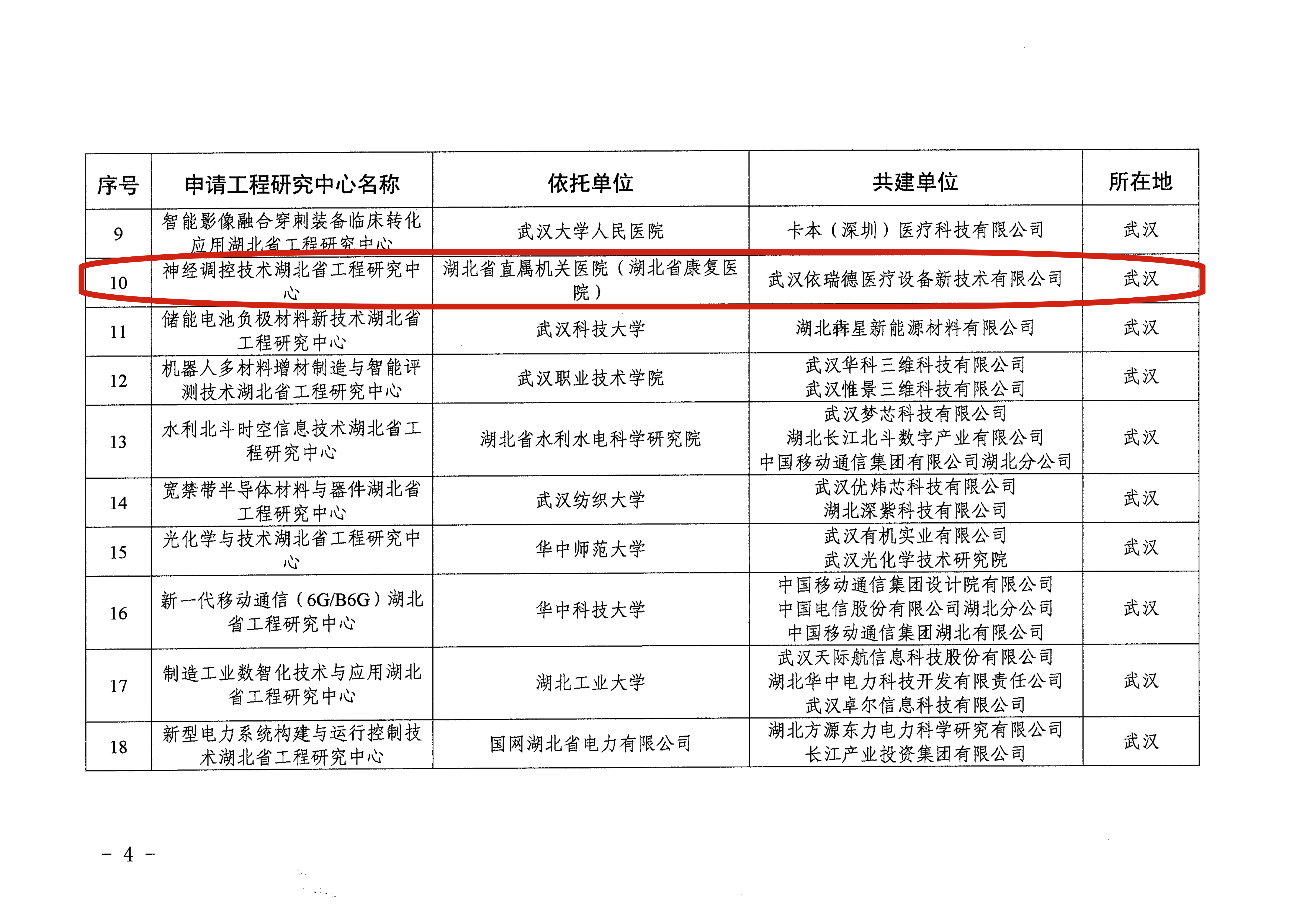 11月25日,湖北省發(fā)展和改革委員會(huì)正式揭曉2024年湖北省工程研究中心認(rèn)定名單,由湖北省直屬機(jī)關(guān)醫(yī)院(湖北省康復(fù)醫(yī)院)牽頭申報(bào),武漢依瑞德醫(yī)療設(shè)備新技術(shù)有限公司參與共建的 “神經(jīng)調(diào)控技術(shù)湖北省工程研究中心” 榮耀獲批。這也是依瑞德集團(tuán)第3個(gè)獲批的省級(jí)工程研究中心。